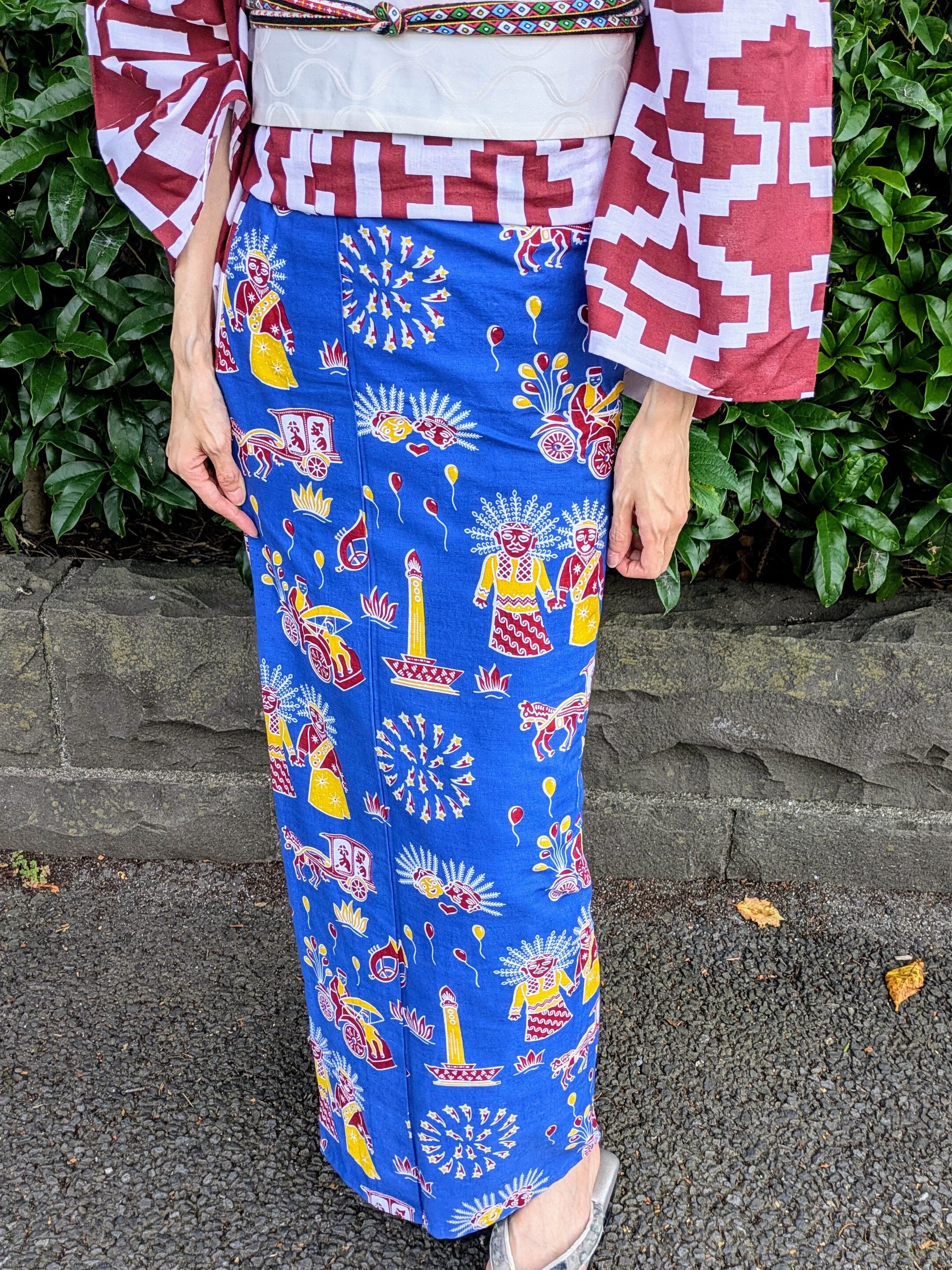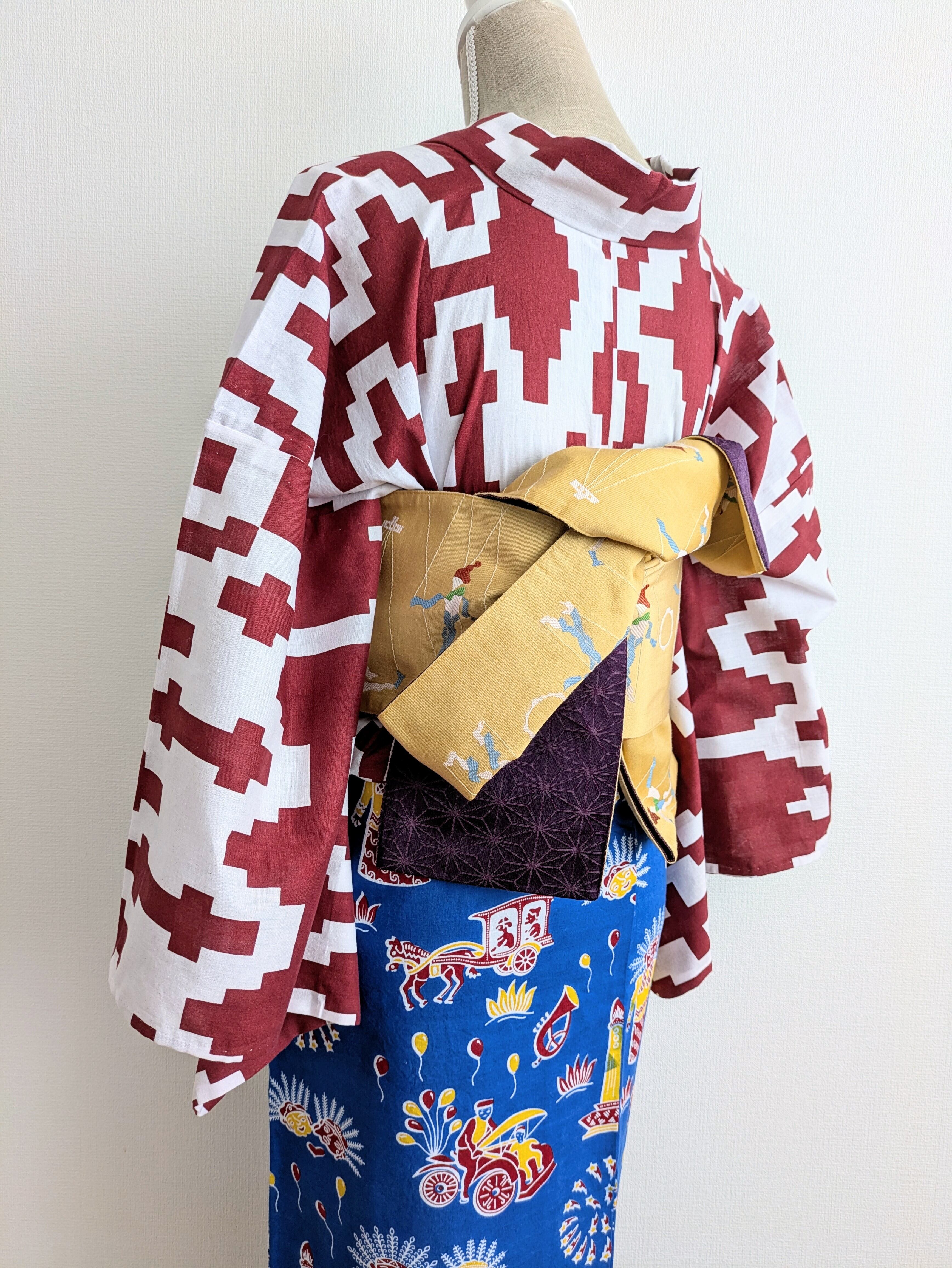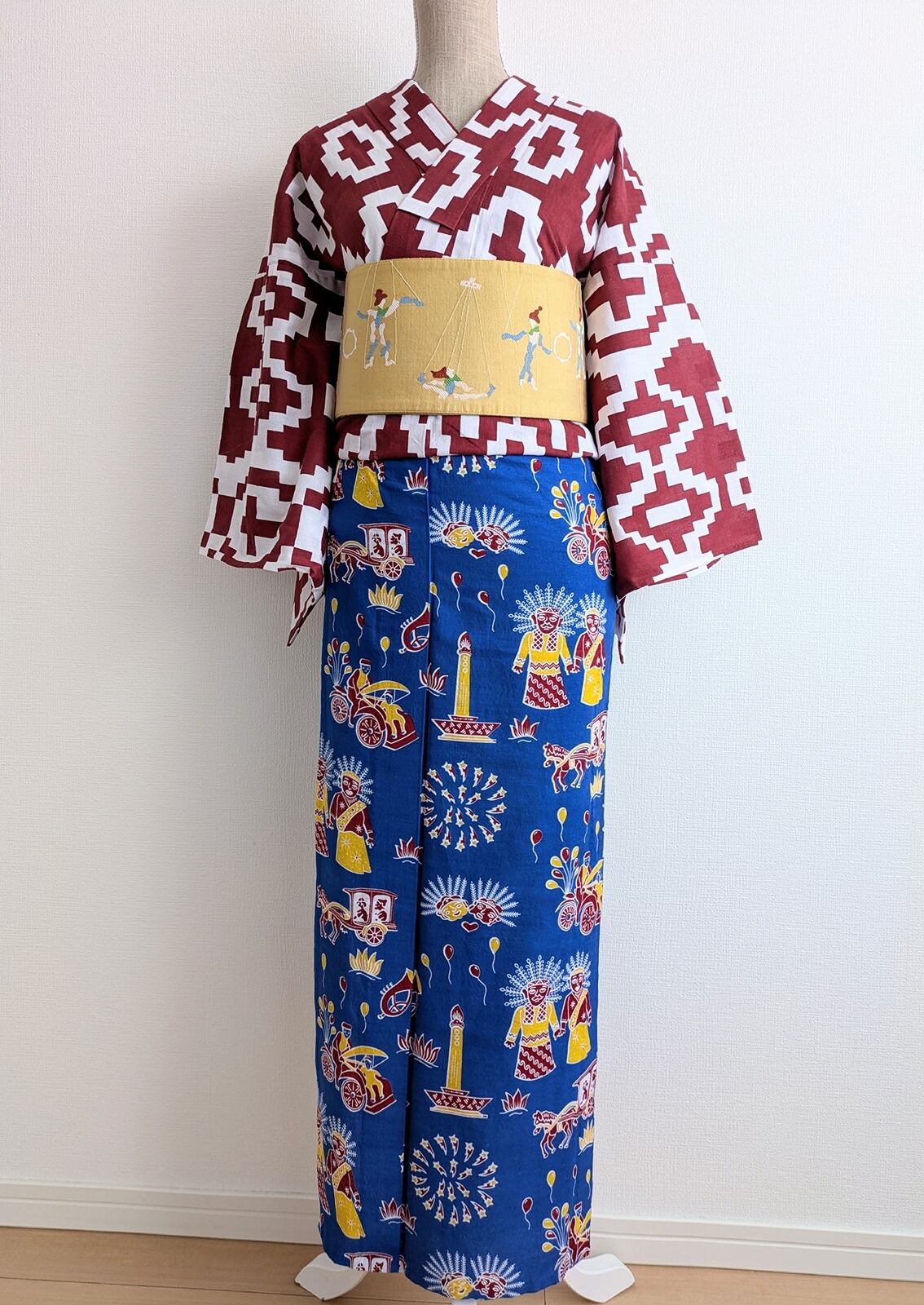 鮮やかな色合いと独特なバティック柄が際立つこの浴衣は、見る人を魅了するデザインです。
