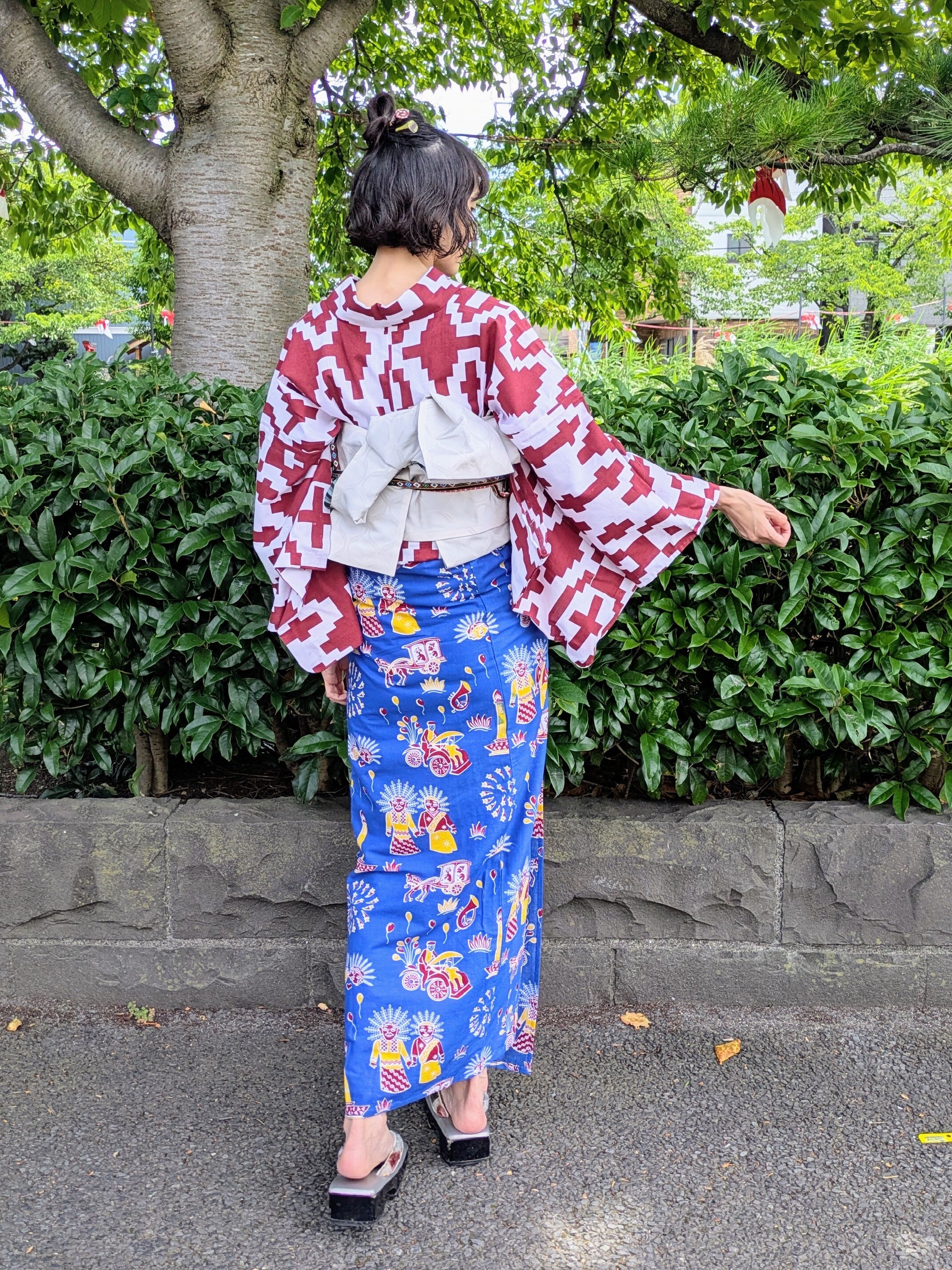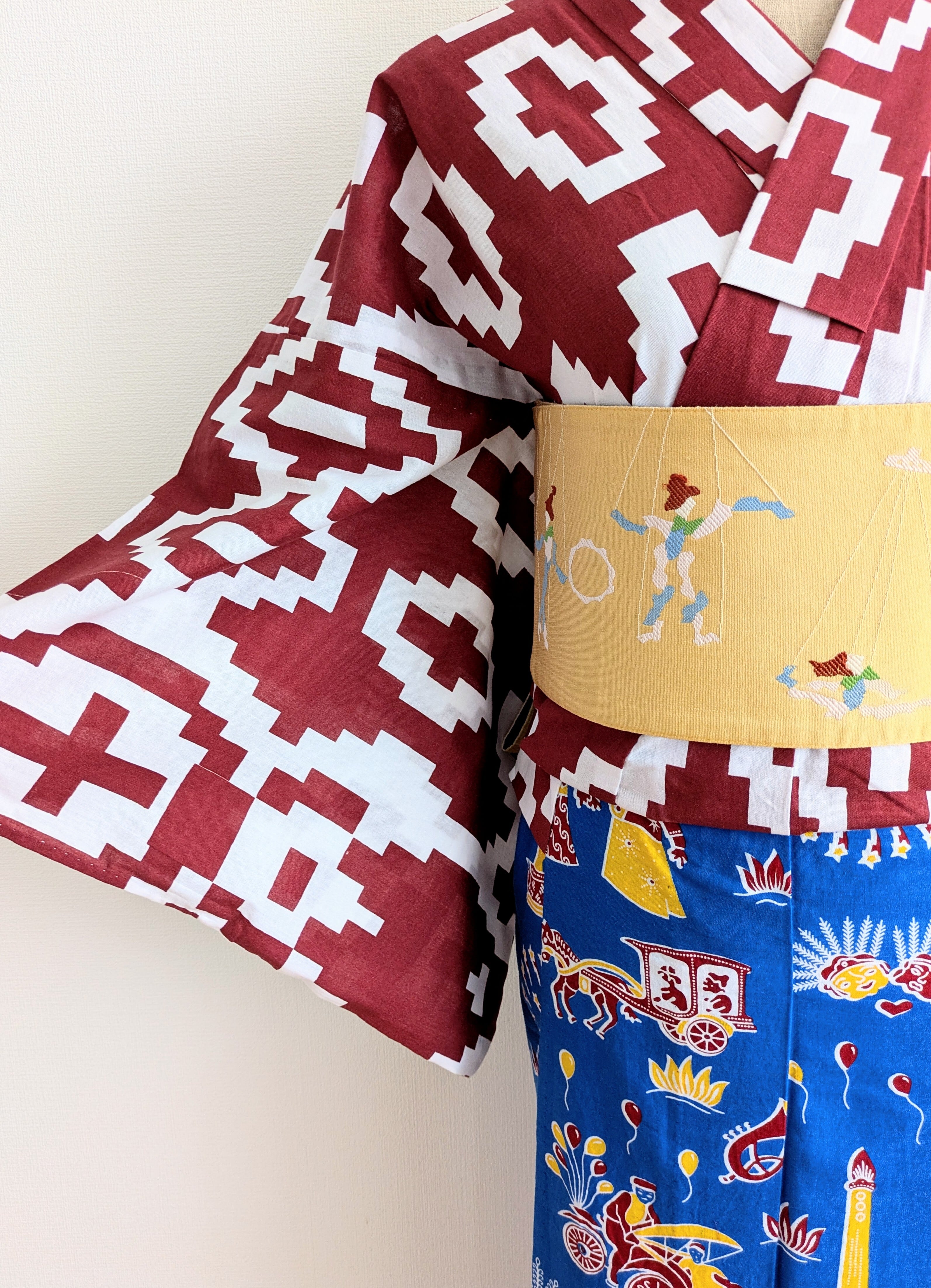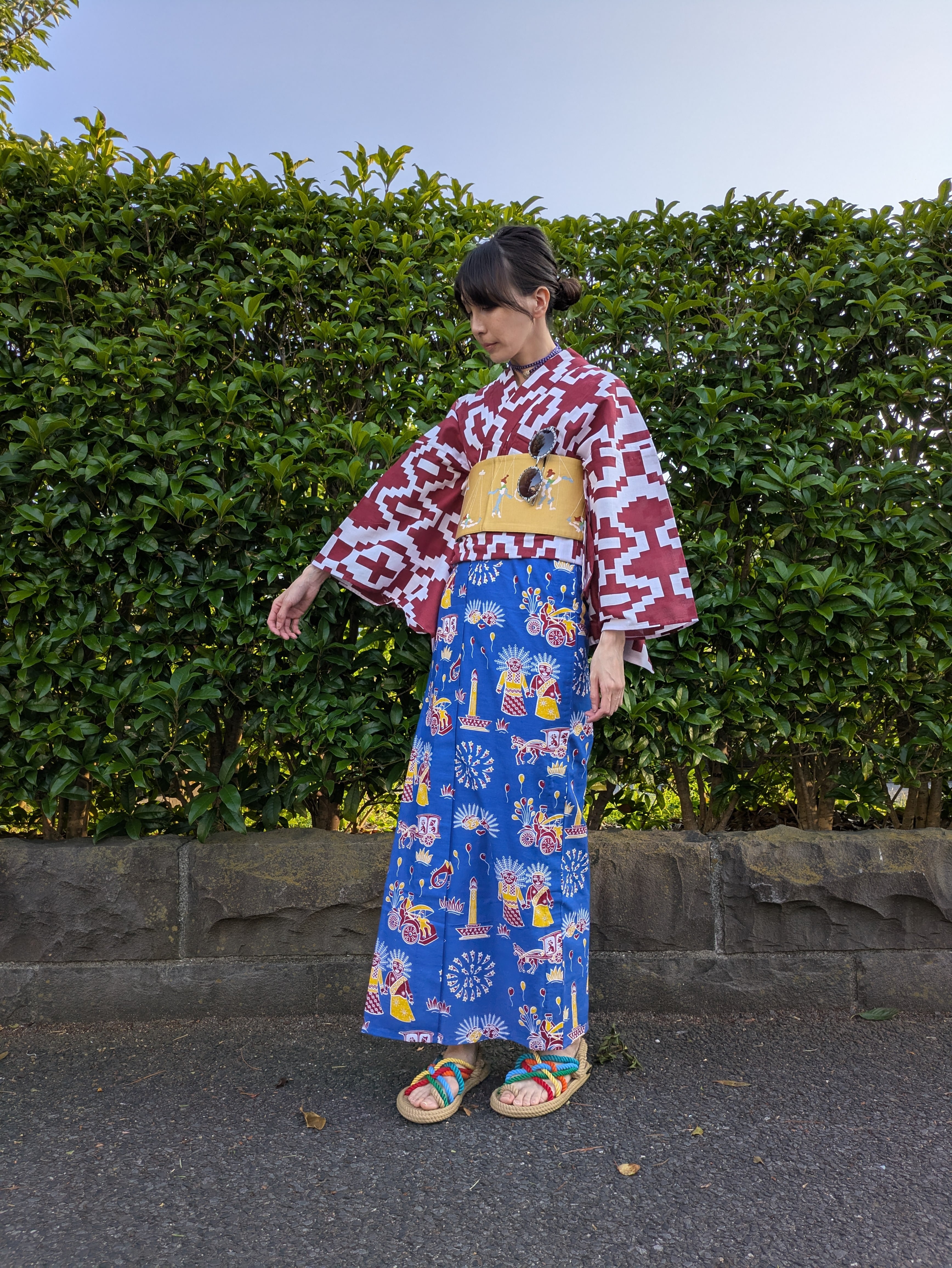 鮮やかな色合いと独特なバティック柄が際立つこの浴衣は、見る人を魅了するデザインです。