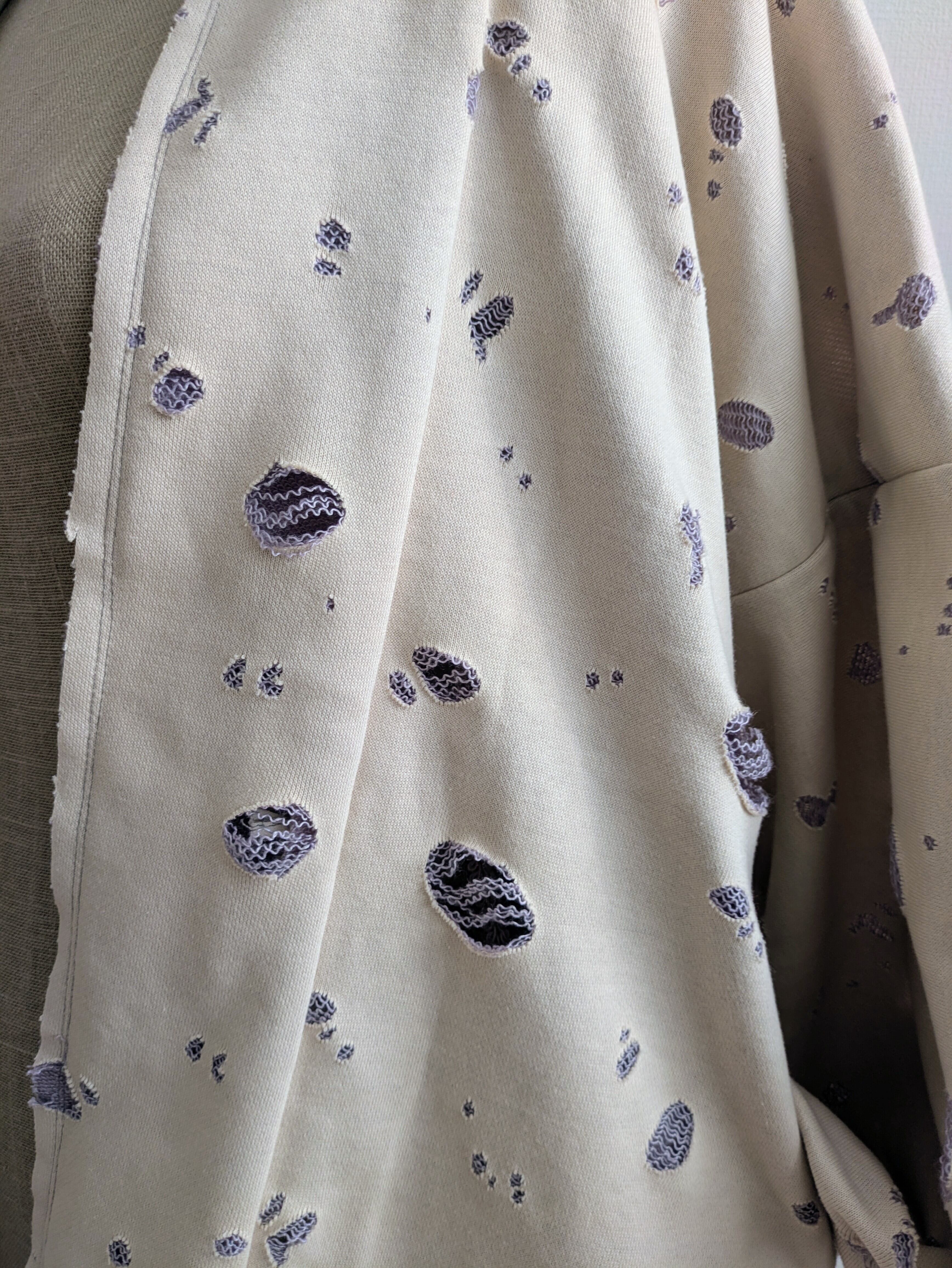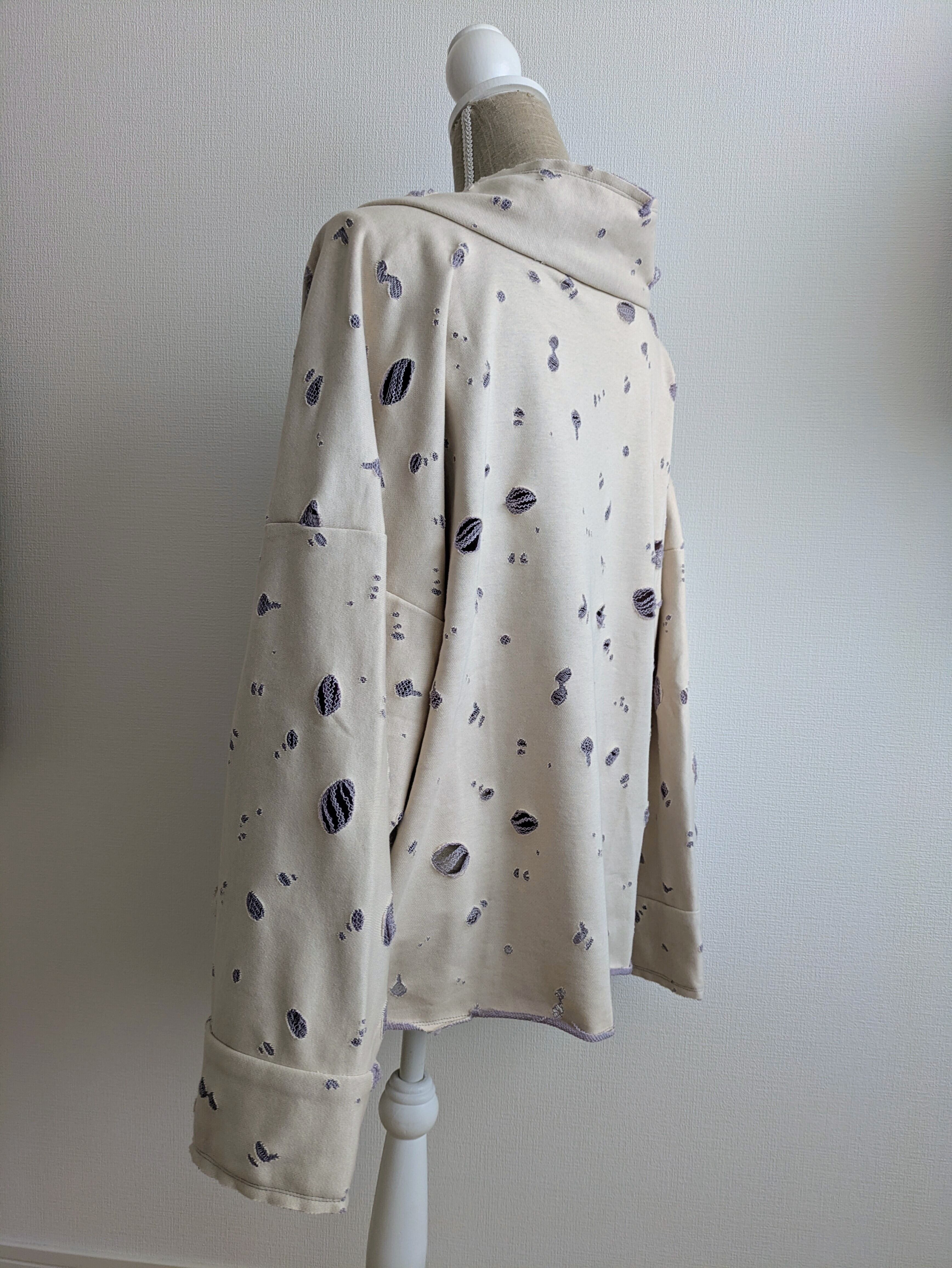 カジュアルなスタイルにぴったりなダメージスウェット羽織。優しいクリームホワイトとパープルの色合いが、あなたのコーディネートにそっと寄り添うアイテムです。