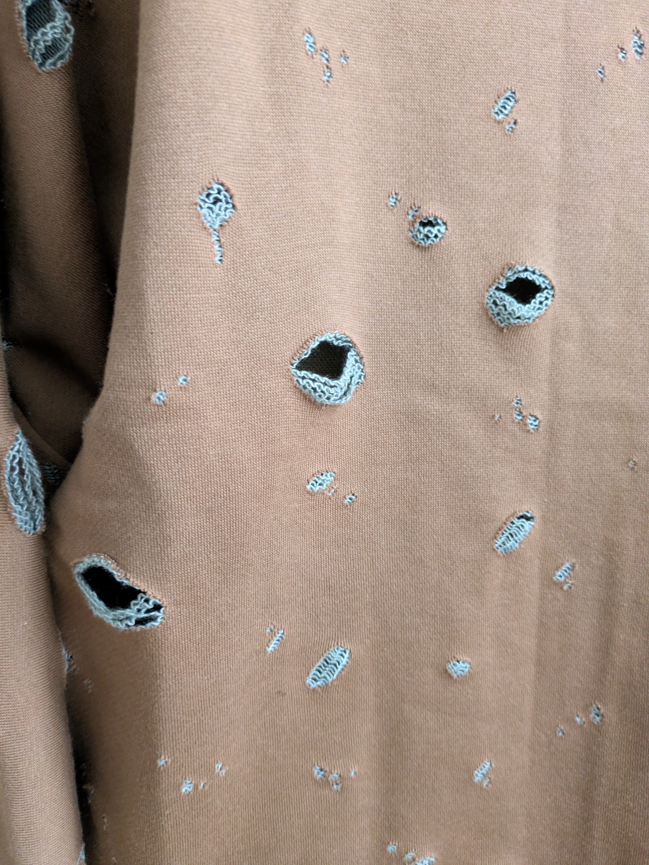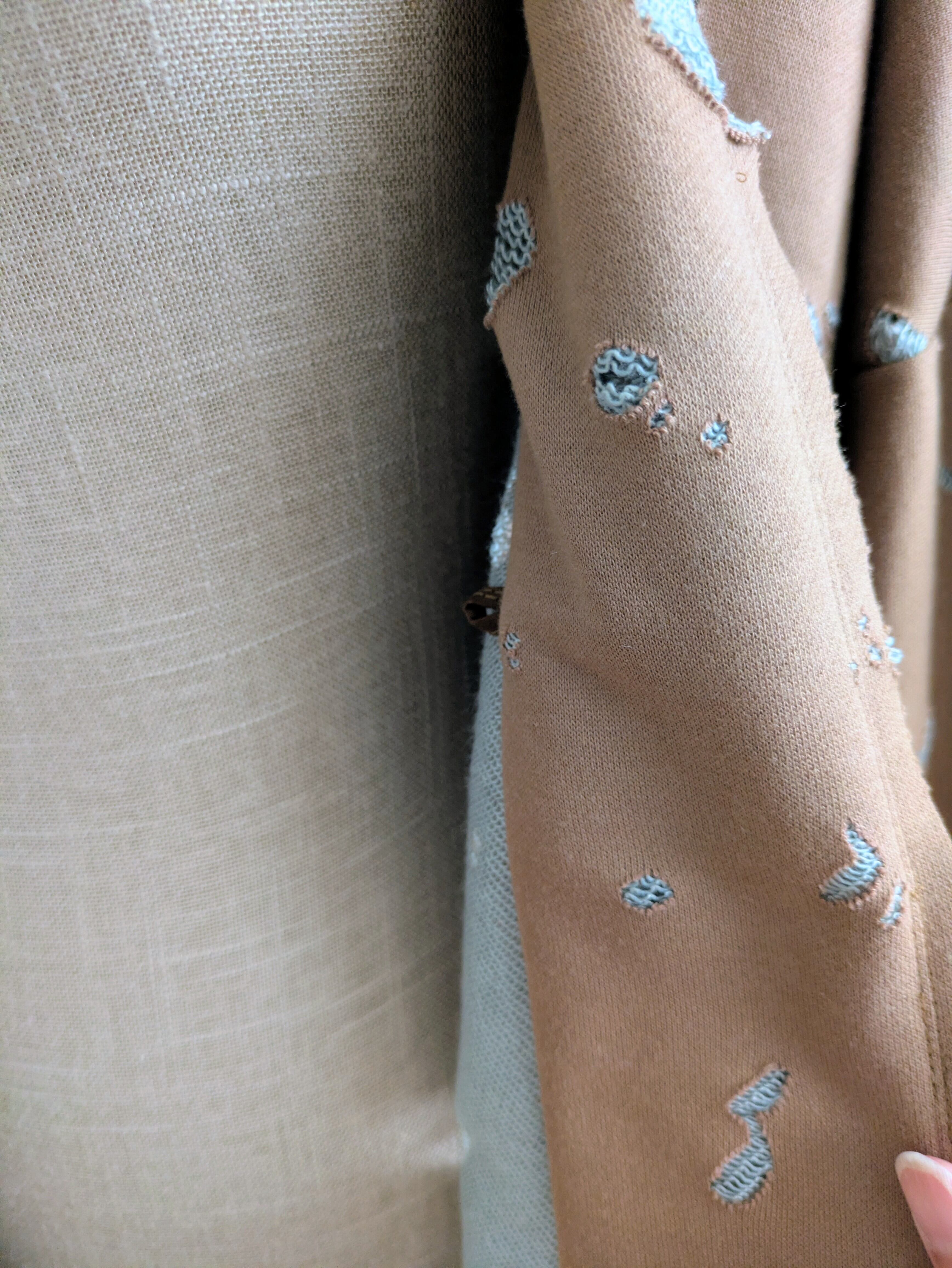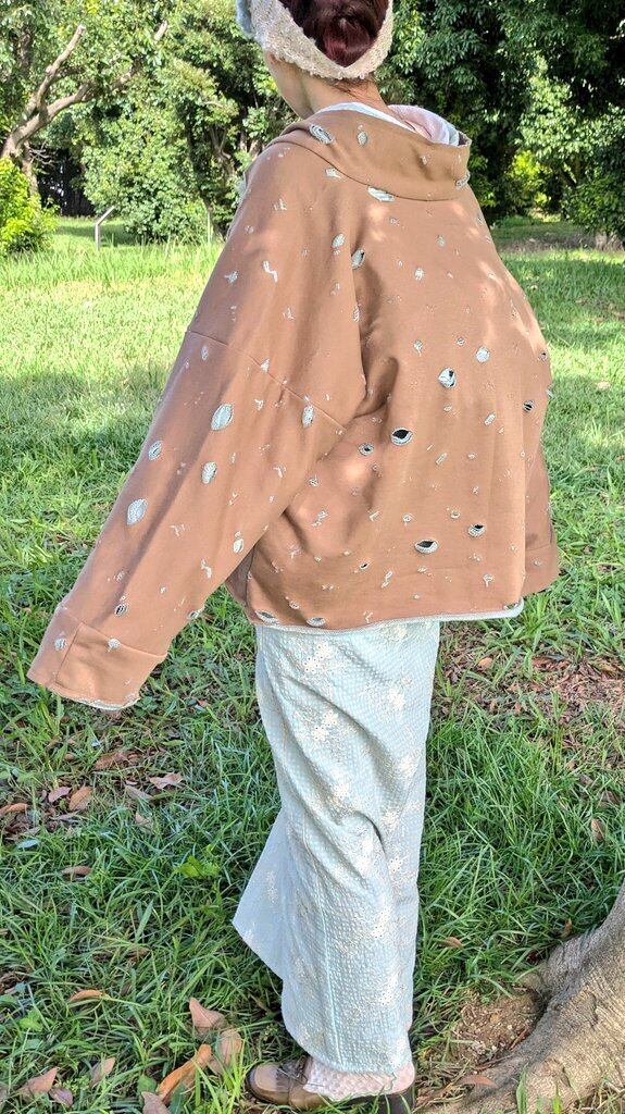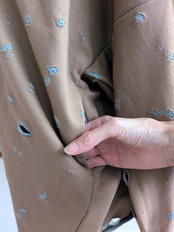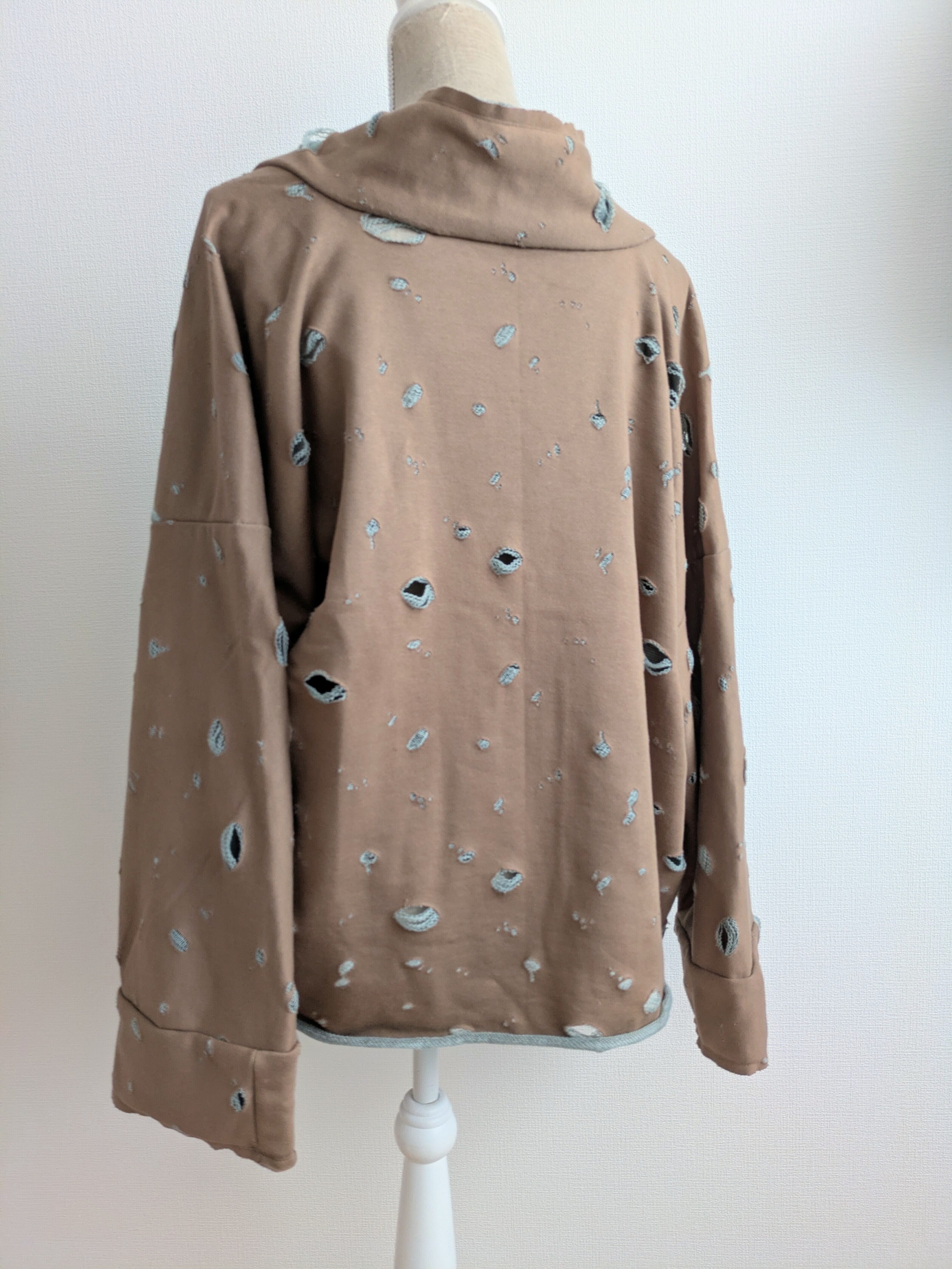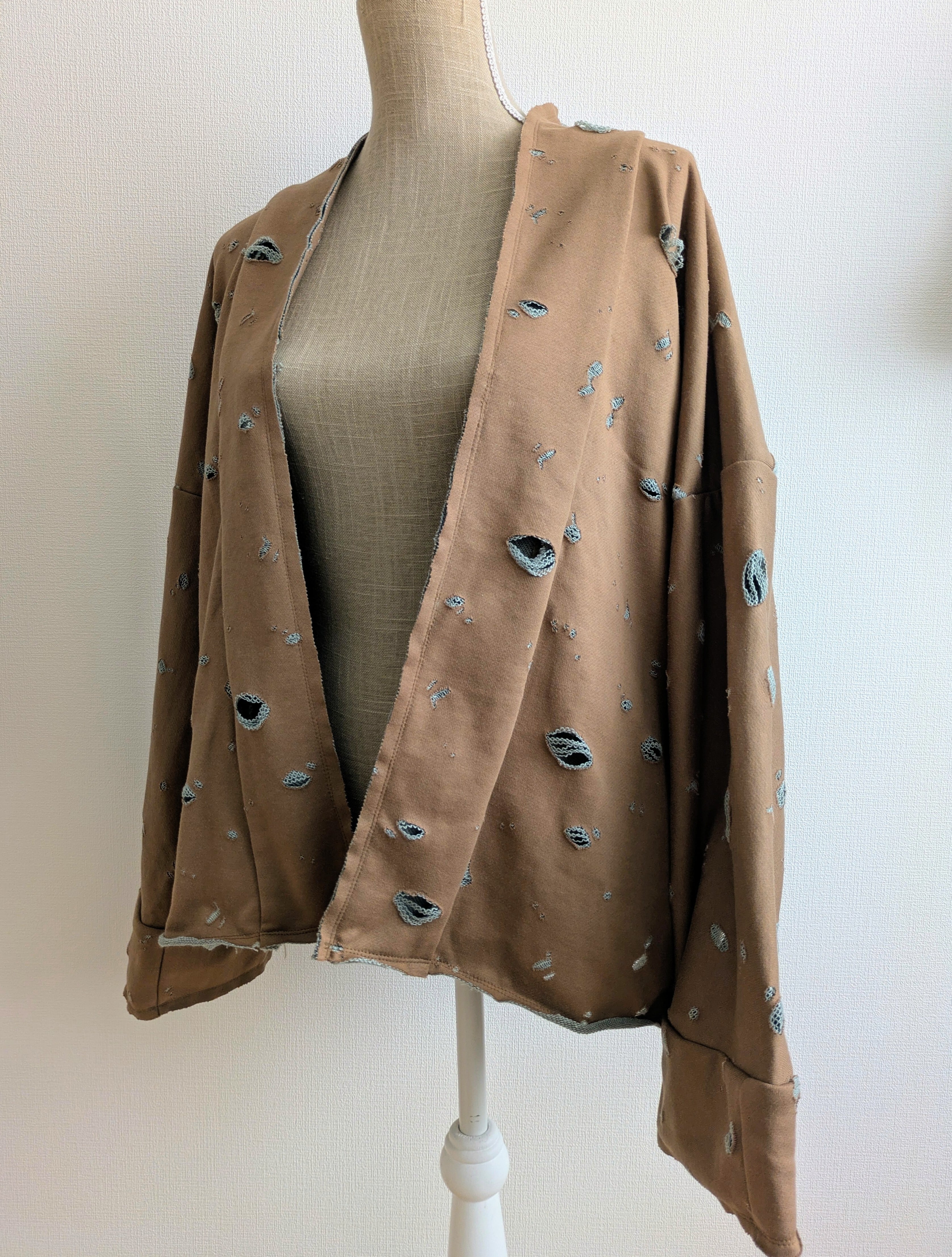 カジュアルなスタイルにぴったりなダメージスウェット羽織。独特のブラウングリーンの色合いが、季節感を引き立てるアイテムです。