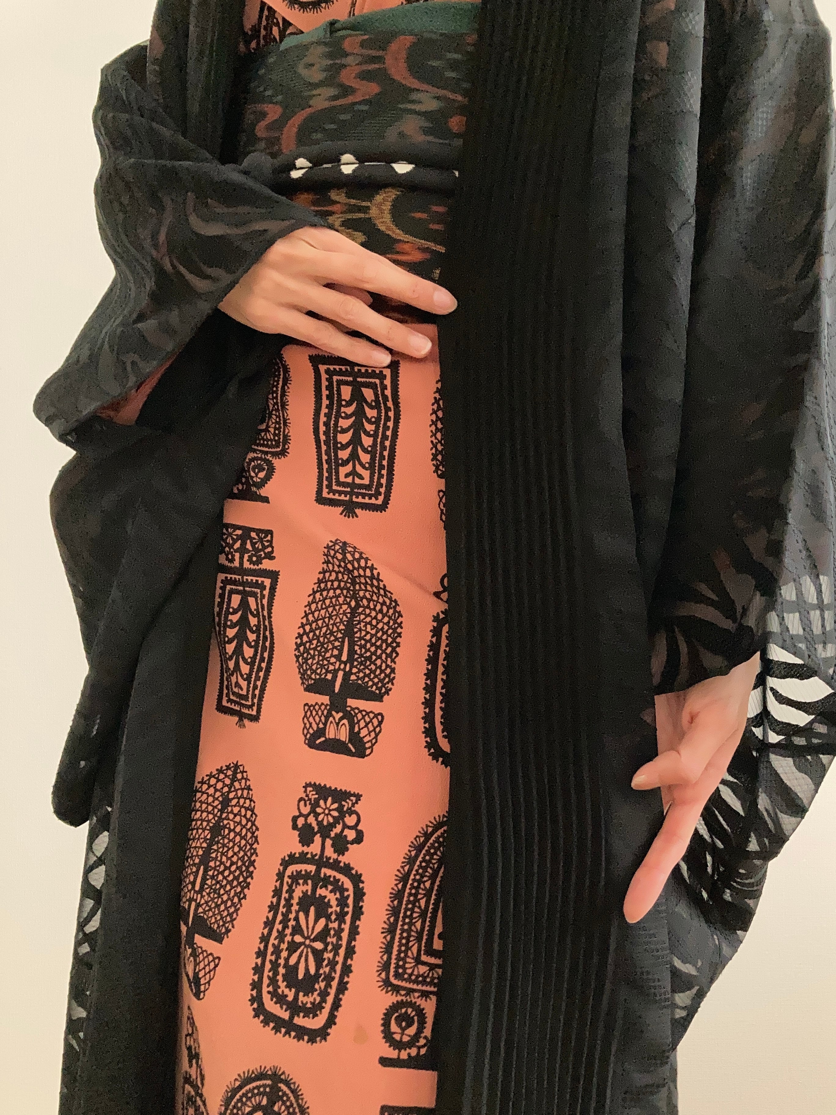 衿は内側に折ってゼブラだけにしたり、ブローチで前を止めて道中着のように着ることも可能です。